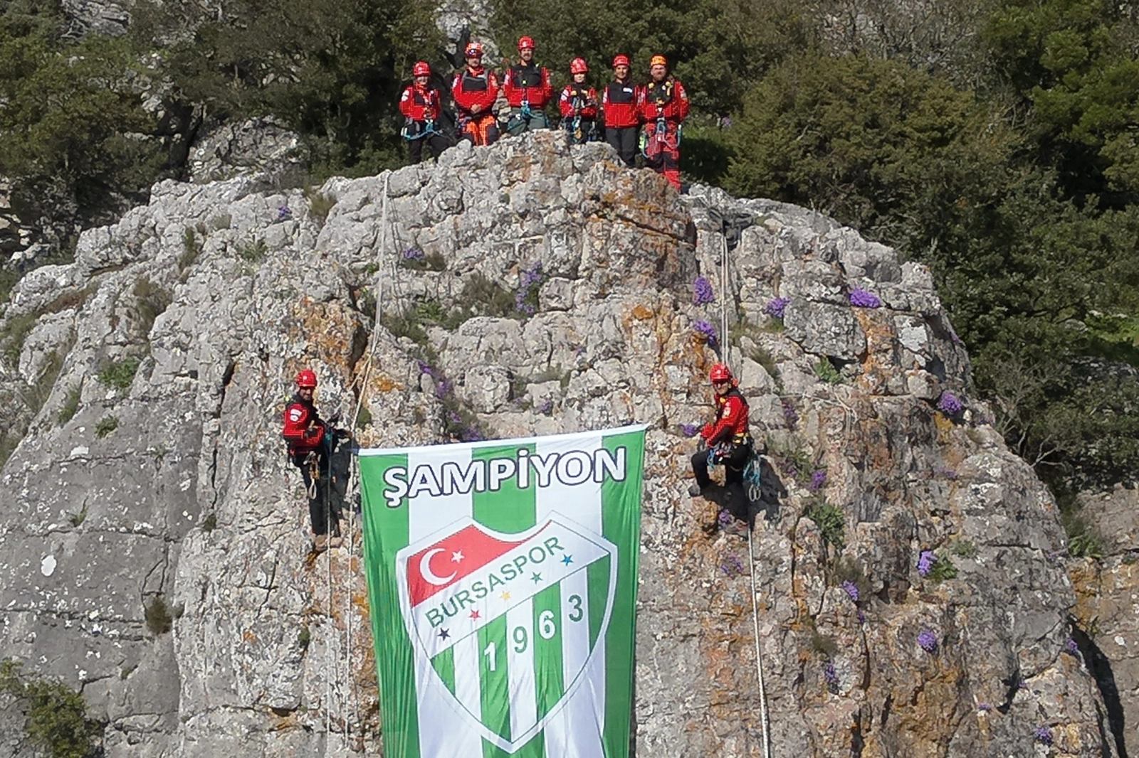 Tatbikatın ardından zirveye ulaşan ekipler, Bursaspor bayrağını açarak anlamlı bir mesaj verdi.