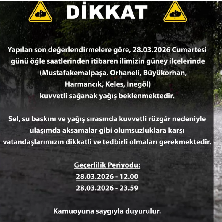 Bursa Valiliği, 6 ilçe için kuvvetli yağış uyarısı yaptı. Açıklama, kurumun resmi sosyal medya hesabından paylaşıldı.